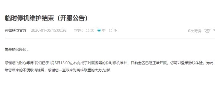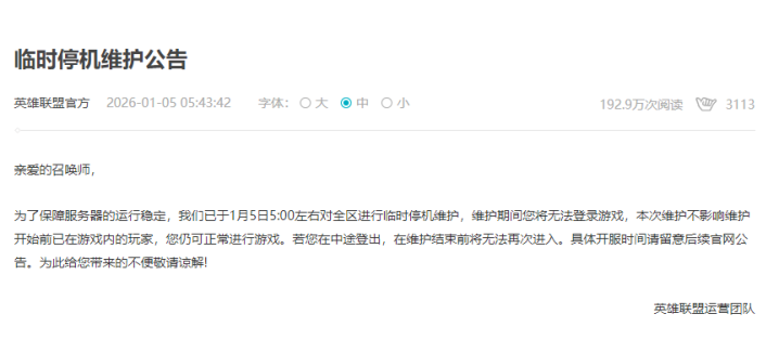 据荆楚网此前报道,1月5日5时左右,《英雄联盟》官网发布临时停机维护公告,《英雄联盟》于1月5日凌晨5点前后对全区进行临时停机维护,维护期间玩家将无法登录游戏,维护开始前已在游戏内的玩家,仍可正常进行游戏。若玩家在中途登出游戏,在维护结束前将无法再次进入。